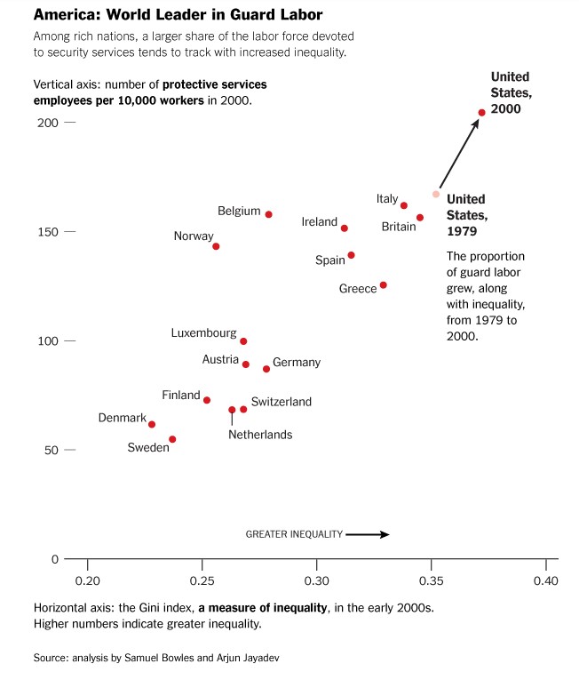 La evidencia de que la desigualdad y la protección privada están positivamente asociadas abunda. El artículo del New York Times el año 2014 de Samuel Bowles y Arjun Jayadev, muestra que el número de empleados en servicios de protección privada por el total de trabajadores aumenta con el índice de desigualdad de Gini: