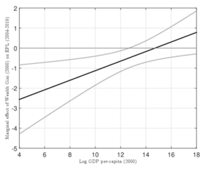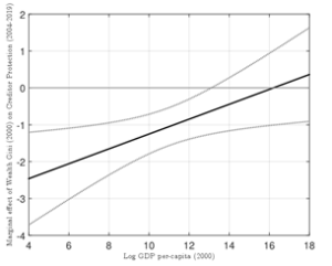 ¿En que se traducen estas predicciones? Si comparamos dos países pobres de África, por ejemplo, el que tiene peor distribución de ingresos tendrá menos protección al trabajo y al crédito. Por el contrario, si tomamos dos países europeos, el que tiene peor distribución del ingreso será el que tiene mayor protección laboral y crediticia. La figura muestra este efecto, calculado usando más de 65 países en el caso de protección al trabajo, y más de 130 países en el caso de protección al crédito. En el eje horizontal aparece la riqueza de los países. En la figura izquierda, el eje vertical muestra el efecto de aumentar la desigualdad sobre la protección al crédito, y en la figura derecha se ve el efecto de mayor desigualdad sobre la protección al trabajo. La figura confirma que en países de bajos ingresos, mayor desigualdad significa que la protección decrece (porque el valor es negativo), pero que el efecto se reduce y luego se invierte a medida que los países se hacen más ricos.